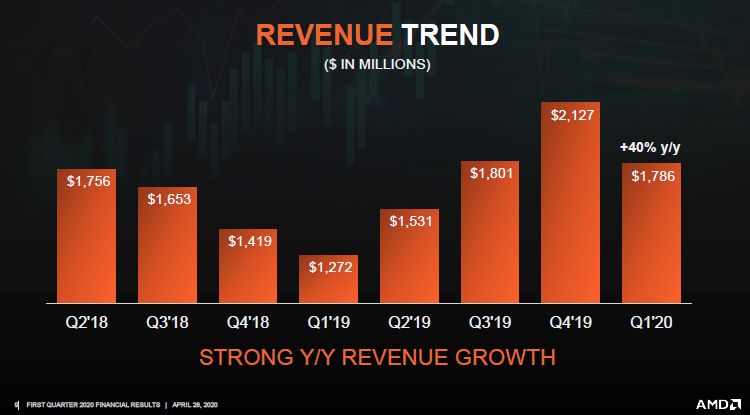 Красный день календаря выпал на 28 апреля, но из-за разницы во времени квартальный отчёт AMD мы разбираем уже сегодня. Вспышка коронавируса не заставила руководство компании пересмотреть прогноз на первый квартал, и выручка AMD действительно почти вписалась в ранее озвученный диапазон, составив $1,79 млрд. В текущем квартале компания рассчитывает увеличить выручку ещё на 4%, но во второе полугодие она уже смотрит с тревогой по поводу снижения потребительского спроса.