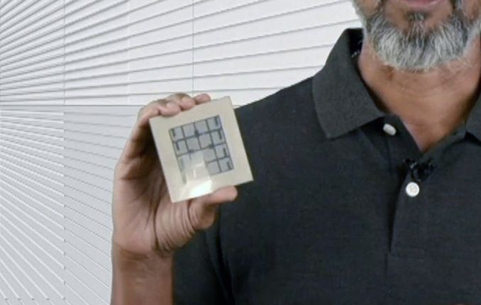 Как известно, на одной подложке EMIB смогут объединяться до четырёх кристаллов с вычислительными ядрами. Двухкристальный вариант Раджа Кодури (Raja Koduri) уже демонстрировал ранее на своей странице в Twitter, на Hot Chips в его руке ещё раз мелькнул четырёхкристальный вариант Xe-HP характерной квадратной формы.