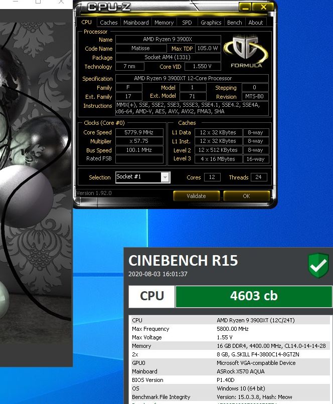 Американский энтузиаст Splave не оставляет в покое флагманскую модель семейства Matisse Refresh – процессор Ryzen 9 3900XT с двенадцатью ядрами. Очередной эксперимент с использованием жидкого азота позволил поднять частоту процессора до 5775 МГц, при этом тест Cinebench R15 был пройден с результатом 4603 балла.