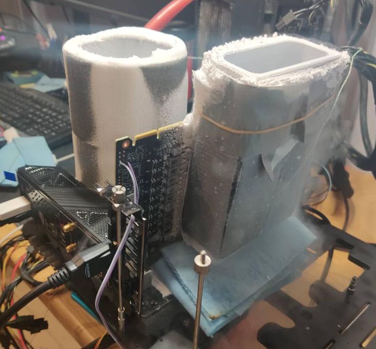 Оверклокер использовал видеокарту ASUS GeForce RTX 3090 серии Strix OC Edition, она охлаждалась жидким азотом. По соседству в материнской плате ASUS ROG Crosshair VIII Impact работал центральный процессор AMD Ryzen 9 5950X, который при помощи жидкого азота был разогнан до 5.6 ГГц.