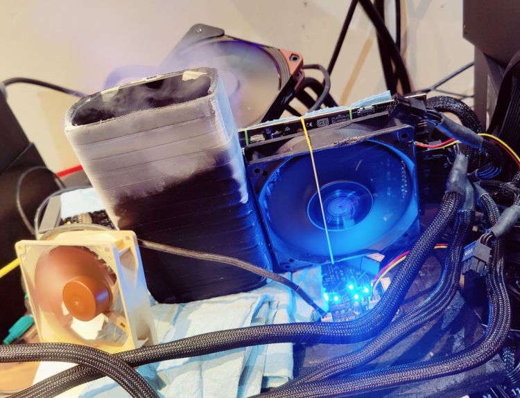 Жидкий азот и дополнительные вентиляторы позволили ему поднять частоты видеокарты до 2655/23104 МГц. Центральный процессор Intel Core i9-10900K довольствовался водоблоком, но демонстрировал способность работать на частоте 5.5 ГГц при активности десяти ядер и двадцати потоков.