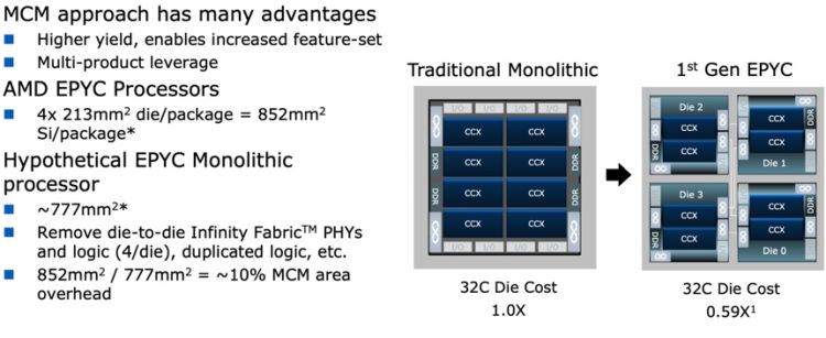 Специалисты AMD пояснили, что чиплеты требуют на 10% больше кремния в совокупности, поскольку некоторые функциональные блоки приходится дублировать, да и для сообщения между кристаллами тоже требуются дополнительные блоки. Конечно, снижение уровня брака и возможность изготовить часть кристаллов по более дешёвым техпроцессам в итоге приводят к снижению себестоимости процессоров. Например, 32-ядерный EPYC при использовании чиплетов оказывается на 41% дешевле теоретического монолитного процессора с аналогичным количеством ядер. Тем не менее, возрастающий расход кремния при переходе на чиплеты в условиях усугубляющегося дефицита полупроводниковых компонентов нельзя считать благоприятным фактором.