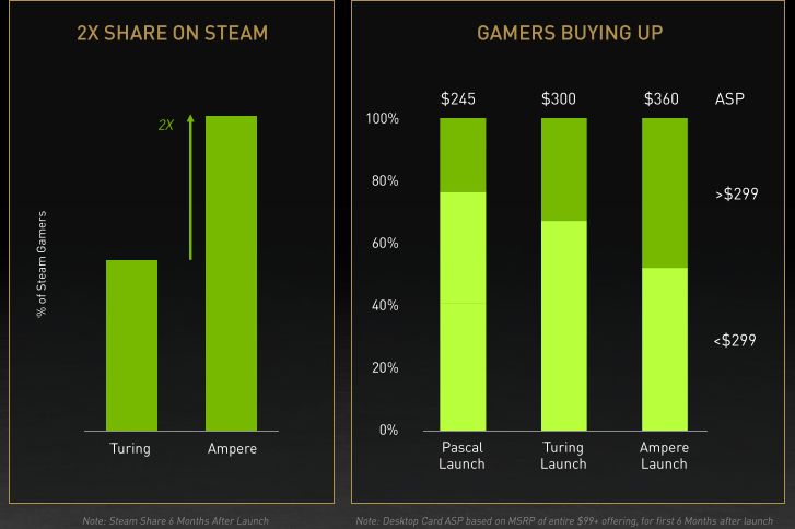 Спустя шесть месяцев после анонса доля Ampere в статистике Steam оказалась в два раза выше, чем в случае с Turing. На этом же интервале выделилось преобладание более дорогих видеокарт в структуре продаж NVIDIA – например, модели стоимостью более $299 формировали более половины объёмов реализации. Кстати, выросла и средняя цена реализации – с $300 до $360, если ориентироваться на статистику NVIDIA. В выборку не попали видеокарты стоимостью до $99.