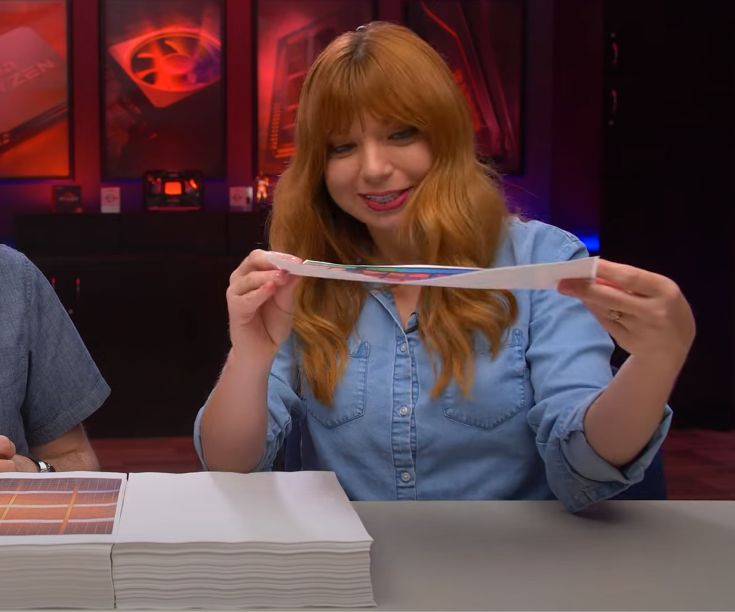 Естественно, перед этим они провели не одну консультацию с инженерами AMD, и только в выборе методов подачи полученной информации опирались на собственную фантазию. Этап подготовки чиплета с вычислительными ядрами к монтажу внешней кеш-памяти они представили на примере листов бумаги, сложенных пачкой.