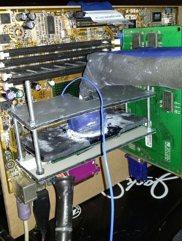 На рубеже веков процессоры Intel Pentium III примерили конструктивное исполнение SECC2, представлявшее собой картридж для установки в щелевой разъём Slot 1. На печатной плате внутри такого картриджа соседствовали кристалл с вычислительными ядрами и микросхемы памяти. В силу конструктивных особенностей такие процессоры довольно сложно охлаждать в ходе экстремального разгона, но греческий энтузиаст Obijuan83 смог изготовить всю необходимую оснастку, и применил для охлаждения Pentium III поколения Katmai небольшую систему фазового перехода, которая «на выходе» выдаёт температуру минус 22 градуса Цельсия.