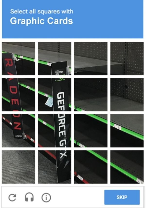 Одним из символов этой причудливой эпохи может стать изображение капчи, опубликованное на страницах Reddit несколько дней назад. Для получения доступа к необходимому интернет-ресурсу пользователю якобы предлагается выбрать те элементы изображения, на которых могут находиться видеокарты.