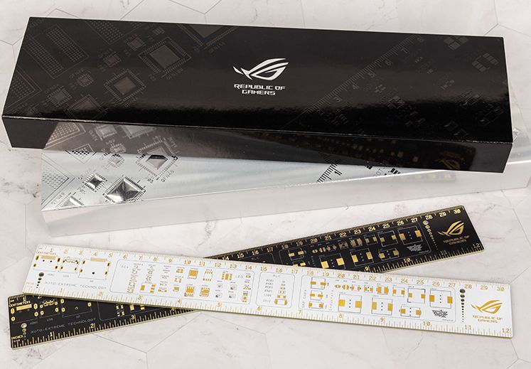 Изделие ASUS ROG содержит свой набор полезной специалисту по разработке или ремонту электроники информации, а также фирменный логотип. По традиции, линейка помогает опознавать электронные компоненты, монтируемые на печатную плату, определять диаметр проводов и конвертировать те или иные физические величины.