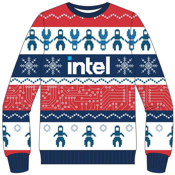 Предлагаемый в специальном интернет-магазине, этот свитер существует в пяти размерах и выполнен из акрилового волокна. Логотип Intel в окружении снежинок невольно подсказывает, в какое время года целесообразно носить этот предмет одежды. На красном фоне орнамент формируют стилизованные токопроводящие дорожки на печатной плате, присутствуют в оформлении и человечки в защитных костюмах, используемых при посещении «чистых комнат», в которых изготавливаются процессоры и чипсеты. Подобный сувенир оценивается Intel в $39,55 без учёта доставки.