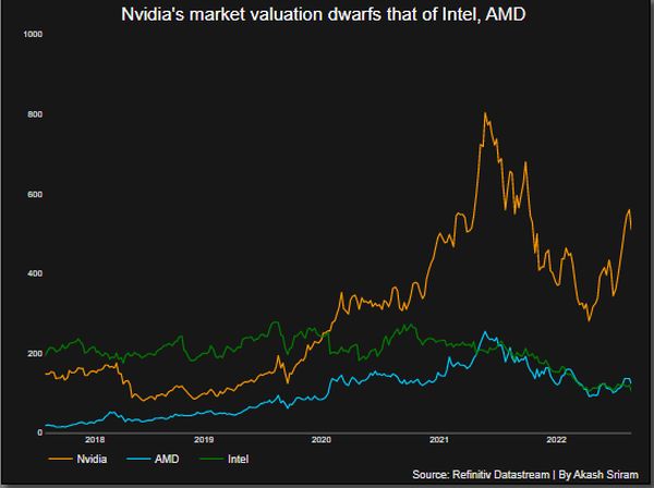 Первую торговую сессию после публикации квартального отчёта, как отмечает Reuters, акции NVIDIA завершили ростом курсовой стоимости на 14%, и теперь капитализация компании достигает $580 млрд. Это в пять раз больше, чем у Intel, и большинство аналитиков сходятся во мнении, что на волне интереса к генеративному искусственному интеллекту серверный бизнес NVIDIA продолжит расти уверенными темпами.