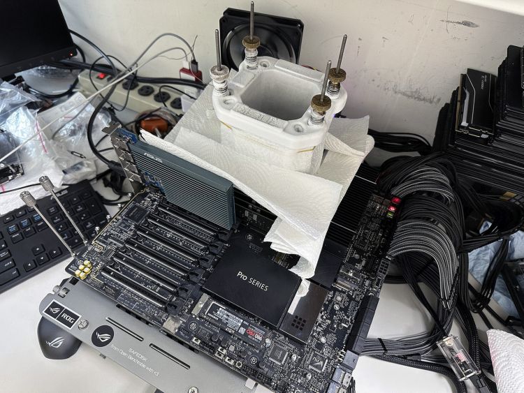 Южнокорейский энтузиаст Safedisk добрался до не совсем обычного сочетания компонентов: центрального процессоры Intel Xeon W7 2495X, который приспособлен для разгона, а также материнской платы ASUS Pro WS W790E-SAGE SE, которая может похвастать аналогичным свойством. Естественно, на центральном процессоре был установлен резервуар для жидкого азота, что и позволило поднять его тактовую частоту до 5416 МГц при номинальном значении 2500 МГц.