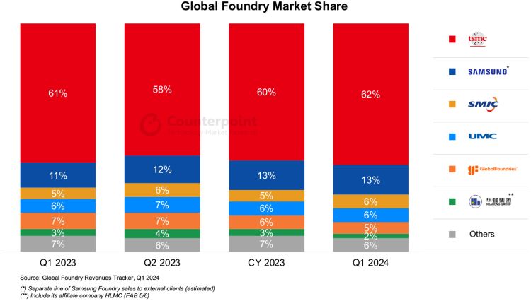 Лидерство TSMC на мировом рынке услуг по контрактному производству чипов трудно оспаривать, и свежий отчёт Counterpoint Research это в очередной раз подтвердил. Тайваньский гигант по итогам первого квартала контролировал 62% этого рынка в показателях выручки, увеличив свою долю на один процентный пункт в годовом сравнении. При этом важно отметить, что занимающая второе место с 13 % южнокорейская Samsung смогла прибавить даже два процентных пункта к своей доле рынка.