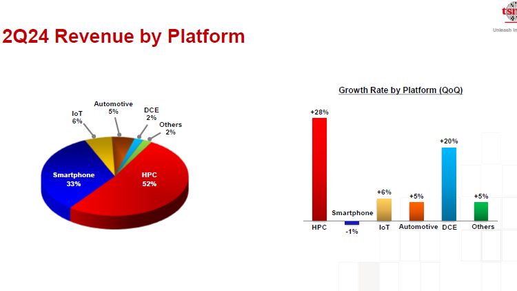 Даже если опираться на сухую статистику второго квартала, доля TSMC от реализации компонентов в сегменте высокопроизводительных компонентов увеличилась с прошлогодних 44 до 52 %. Последовательно выручка на этом направлении увеличилась на 28%. Сегмент смартфонов при этом последовательно потерял в выручке 1% и остался на уровне одной трети совокупного размера выручки TSMC, как и год назад. Впрочем, в текущем квартале руководство компании ожидает столкнуться с ростом выручки именно в сегменте смартфонов, за счёт сезонных тенденций, но важную роль сохранит и сегмент компонентов для систем искусственного интеллекта. В текущем квартале TSMC рассчитывает выручить от $22,4 до $23,2 млрд.