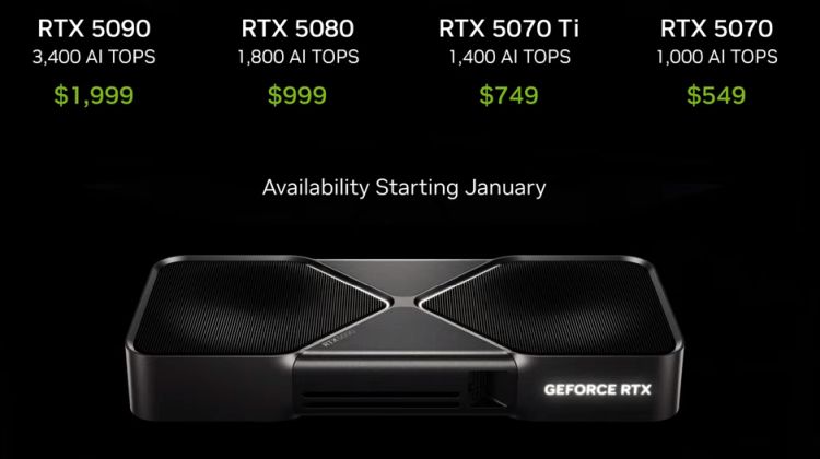 Игровые решения семейства GeForce RTX 50 в настольном сегменте начнут поставляться уже в текущем месяце, старшая GeForce RTX 5090 оценена в $1999, а ближайшая более дешёвая видеокарта по имени GeForce RTX 5080 будет стоить лишь $999. Младшая GeForce RTX 5070 за $549 предложит уровень быстродействия GeForce RTX 4090, на ступень выше расположится GeForce RTX 5070 Ti за $749.