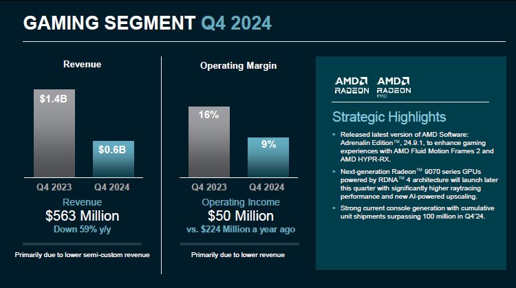В четвёртом квартале игровая выручка AMD сократилась в годовом сравнении на 59% до $563 млн, операционная прибыль снизалась более чем в четыре раза до $50 млн, а норма операционной прибыли упала с 16 до 9 %. Руководство компании было вынуждено признать, что её в данном сегменте подводят не только устаревающие игровые консоли клиентов, но и «пересменка» в поколениях игровых видеокарт. Новое поколение дискретной графики с архитектурой RDNA 4 поступит в продажу в начале марта, и пока потенциальные покупатели не спешат тратить свои деньги.