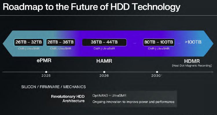 Так, массовые поставки жёстких дисков с технологией магнитной записи с подогревом (HAMR) компания рассчитывает развернуть в следующем году. Используя технологии CMR и UltraSMR, эта компания рассчитывает увеличить объём жёстких дисков до 44 Тбайт, а в этом году будет расширено использование технологии ePMR, но пределом объёма станут 36 Тбайт. На рубеже этого и следующего десятилетий объём жёстких дисков WD увеличится до 80 или 100 Тбайт, а в тридцатых годах текущего столетия найдёт применение технология магнитной записи с точечным подогревом (HDMR).