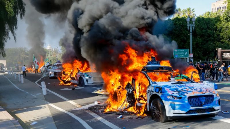 Протесты в Лос-Анджелесе, как отмечает CNBC, затронули деятельность компании Waymo, которая эксплуатирует в отдельных его районах свои беспилотные такси на платформе электромобилей Jaguar I-Pace. Судя по кадрам хроники, машины оказались беззащитны перед вандалами, которые сперва их разукрасили политическими лозунгами, а затем подожгли. В кадры новостных репортажей попали как минимум пять сгоревших прототипов, прочие были изуродованы и также потребуют серьёзного ремонта, если не будут сожжены позже.