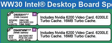 Сегодня на страницах сайта VR-Zone появились выдержки из роадмапа Intel, датированного концом июля. Один из слайдов содержал упоминание о поставках в комплекте с материнскими платами D925XHY и D945PWM видеокарт GeForce 6200 LE с поддержкой технологии TurboCache и 16 Мб набортной памяти.