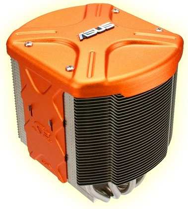 Основание кулера выполнено из чистой меди, оно соединяется с радиатором при помощи пяти тепловых трубок. Рёбра радиатора выполнены из алюминия, они имеют специальную изогнутую форму для повышения эффективности отвода тепла. Оранжевый кожух в верхней части кулера направляет воздушный поток вниз, на силовые элементы материнской платы. Элегантное и эффективное решение для кулера с "башенной" компоновкой.