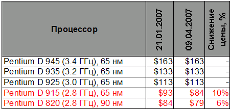 Напомним, что ещё до сегодняшнего снижения цен компания Intel должна была немного уценить процессоры Pentium D и Pentium 4, и знакомство с существующим прайс-листом подтверждает наличие некоторых изменений. Младшие двухъядерные процессоры Pentium D подешевели на 6% и 10% соответственно, причём 90 нм процессор Pentium D 820 (2.8 ГГц) в прайс-листе до сих пор присутствует: