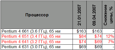 Пара 65 нм процессоров Pentium 4 6x1 тоже потеряла в цене от 7% до 12%. Что характерно, теперь Pentium 4 641 (3.2 ГГц) и Pentium 4 631 (3.0 ГГц) стоят одинаково - $69.