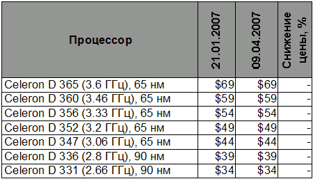 Цены процессоров Celeron D 3xx девятого апреля не изменились, можно лишь освежить в памяти их ассортимент - две младших модели до сих пор представляют в ассортименте продукции 90 нм техпроцесс.