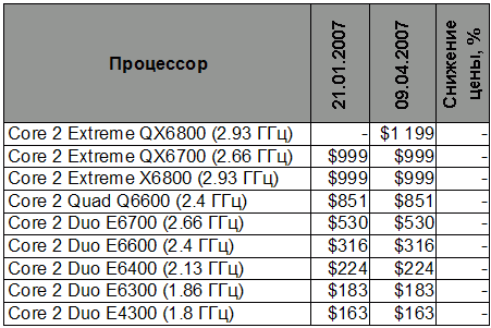 Девятое апреля можно считать и днём рождения процессора Core 2 Extreme QX6800 (2.93 ГГц), который стоит $1199. Напомним, что в четвёртом квартале процессоры Core 2 Extreme QX6700 (2.66 ГГц) и Core 2 Extreme X6800 (2.93 ГГц) будут упразднены, а до тех пор у обладающих бюджетом порядка $1000 любителей свободного множителя есть хороший выбор.
