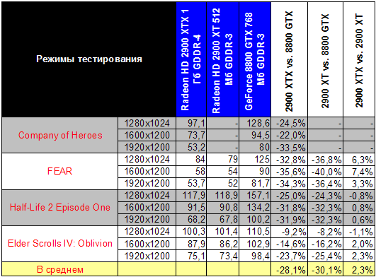 Как видно из таблицы с результатами тестирования видеокарт в играх, Radeon HD 2900 XTX не только проигрывает GeForce 8800 GTX в среднем 28%, но и иногда оказывается чуть медленнее Radeon HD 2900 XT. Среднее преимущество Radeon HD 2900 XTX над своим более дешёвым сородичем составляет пару процентов. Понятно, почему AMD и партнёры не торопятся выпускать эту видеокарту на рынок.