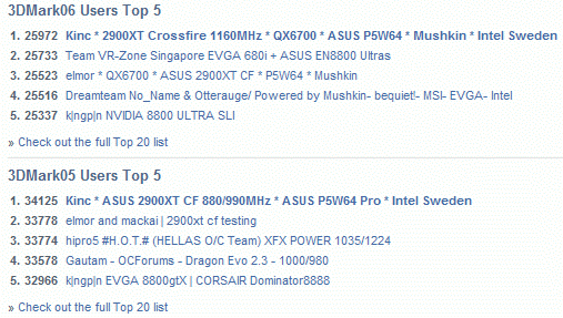 Другими словами, теперь первую строчку в рейтинге Futuremark 3DMark'06 занимает система на базе двух Radeon HD 2900 XT, показавшая результат в 25 972 "попугая". Видеокарты были разогнаны до 1160/1920 МГц, а четырёхъядерный процессор Core 2 Extreme QX6700 (2.66 ГГц) работал на частоте 5030 МГц. Как и в прошлый раз, всё это хозяйство охлаждалось при помощи жидкого азота, на видеокартах были сделаны вольтмоды. Например, видеочипы работали при напряжении 1.5 В и температуре минус 65 градусов Цельсия.