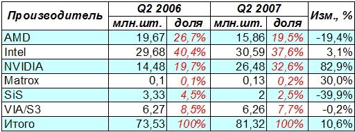 Как изменилось положение дел во втором квартале, поведали коллеги с сайта The Inquirer. Они тоже ссылаются на данные свежего отчёта Jon Peddie Research. Хотя второй квартал обычно характеризуется вялыми продажами для индустрии в целом, компании NVIDIA удалось существенно увеличить объёмы поставок – по сравнению с аналогичным периодом прошлого года прирост составил 82,9%. Теперь NVIDIA занимает 32,6% всего графического рынка, в настольном секторе её доля равна 43,5%, в мобильном – 27%.
