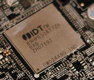 Тем не менее, плата вызывает большой интерес и благодаря наличию четырёх слотов PCI Express x16. Причём, первые два слота (белого цвета) работают в полноскоростном режиме, в то время как жёлтые слоты подключены к шине PCI Express x4 и соответствуют лишь спецификации PCI Express 1.1. Для их подключения на MSI X38 Diamond применяется специальный свитч производства компании IDT. Именно этот загадочный чип и скрыт на плате под радиатором рядом с южным мостом.