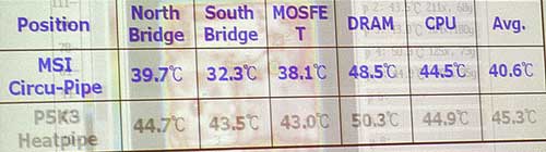 Для отвода тепла от компонентов набора логики на плате используется фирменная система охлаждения на тепловых трубках Circu-Pipe. Согласно данным испытаний, под нагрузкой она обеспечивает ощутимо лучшую эффективность, нежели система охлаждения платы ASUS P5K3.