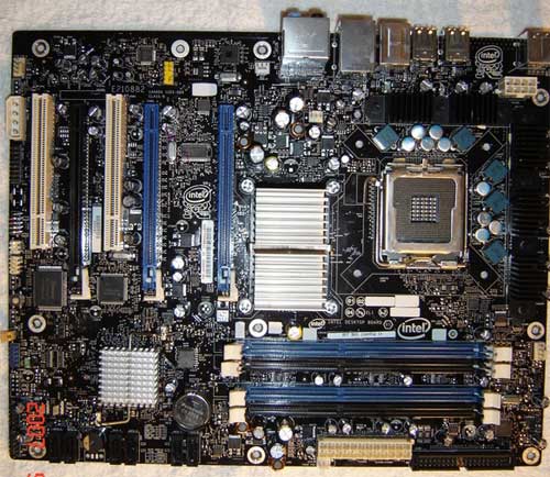 Внешний вид материнской платы вызывает смешанные чувства. Как мы видим, несмотря на то, что тепловыделение северного моста X38 под нагрузкой может достигать 36.5 Вт, Intel решил обойтись без применения хитроумных систем охлаждения чипсета, ограничившись лишь обычным алюминиевым радиатором. Этот момент можно отнести как к плюсам, так и к минусам платы, но судя по первым отзывам, чипсет на Bonetrail не перегревается даже в случае использования в системе водяного охлаждения CPU.