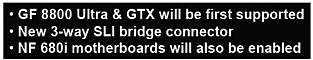 Как сообщают сайты ExpReview и VR-Zone, одним из первых технологию "тройного SLI" должен поддержать чипсет nForce 780i SLI (C72XE). Для обмена данными между тремя видеокартами будет использоваться мостик нового типа, охватывающий сразу три видеокарты. Тем не менее, он позволит объединять видеокарты GeForce 8800 Ultra и GeForce 8800 GTX без какой-либо адаптации.