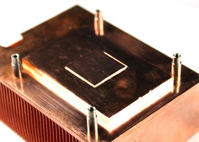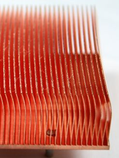 Медный радиатор одного из видеочипов имеет тонкие изогнутые рёбра.