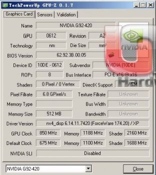 С другой стороны, мы уже могли убедиться, что GeForce 9800 GTX имеет усиленную подсистему питания и 0.8 нс память типа GDDR-3, а также комплектуется довольно внушительным кулером. Как это влияет на разгонный потенциал видеокарты, попробовал выяснить сайт Uni Hardware. Было установлено, что напряжение видеочипа изменяется в пределах 1.2-1.21 В в состоянии покоя, и в пределах 1.26-1.27 В под нагрузкой. Напряжение на памяти равно 2.0 В. Более мощный кулер вполне способен компенсировать повышение напряжения ядра на 0.02 В по сравнению с GeForce 8800 GTS 512 Мб. При температуре воздуха 18 градусов Цельсия чип нагревается в состоянии покоя до 35 градусов Цельсия, и до 53 градусов Цельсия под нагрузкой. Вентилятор при этом работает на полной скорости.