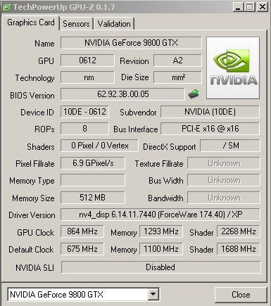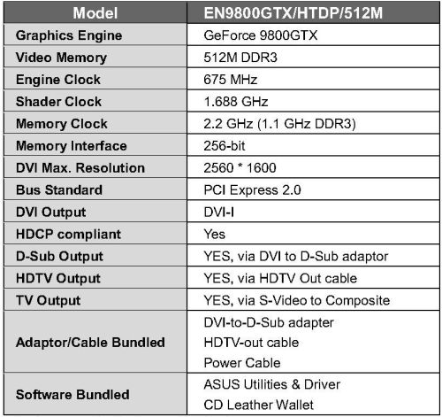 Эталонные версии GeForce 9800 GTX будут работать на частотах 675/1688/2200 МГц, использовать 256-битную шину памяти, комплектоваться 512 Мб памяти типа GDDR-3 со временем выборки 0.8 нс. Аналогичное описание можно обнаружить и в одной из брошюр, подготовленных компанией Asus для видеокарты EN9800GTX/HTDP/512M.