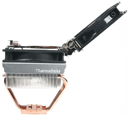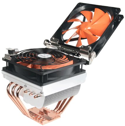 Ноу-хау этой модели заключается в использовании шарнирного фиксатора для дополнительного вентилятора, который можно наклонять в диапазоне от 0 до 45 градусов. Разместить этот вентилятор можно таким образом, чтобы он обдувал северный мост или видеокарту, либо модули памяти. Фиксатор позволяет устанавливать любые вентиляторы типоразмеров от 40 до 120 мм, так что каждый оверклокер сможет выбрать дополнительный вентилятор с нужными характеристиками.