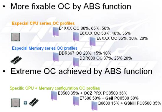 Каждый профиль будет настроен под конкретную величину разгона конкретной модели процессора, аналогичные профили предусмотрены и для настройки модулей памяти. Наконец, часть профилей оптимизируется под определённое сочетание процессора и модулей памяти. Неопытному оверклокеру такие профили помогут быстрее найти подходящее сочетание настроек для повышения быстродействия системы.