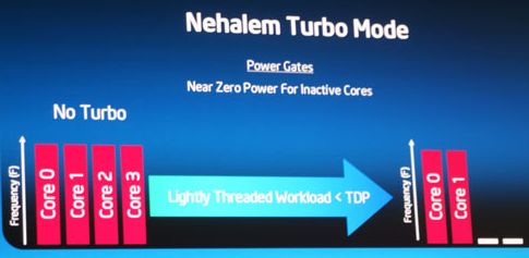 Таким образом, загруженные ядра в процессорах поколения Nehalem будут ускоряться, а незагруженные могут быть полностью отключены.