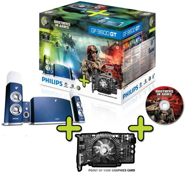 Компания Point of View совместно с Philips и Ubisoft решила предложить уникальный комплект, состоящий из видеокарты GeForce 9500 GT или GeForce 9600 GT с 512 Мб памяти типа GDDR-3, специальной свето-акустической системы amBX ProGamer и полной версии игры Brother in Arms: Hell’s Highway.