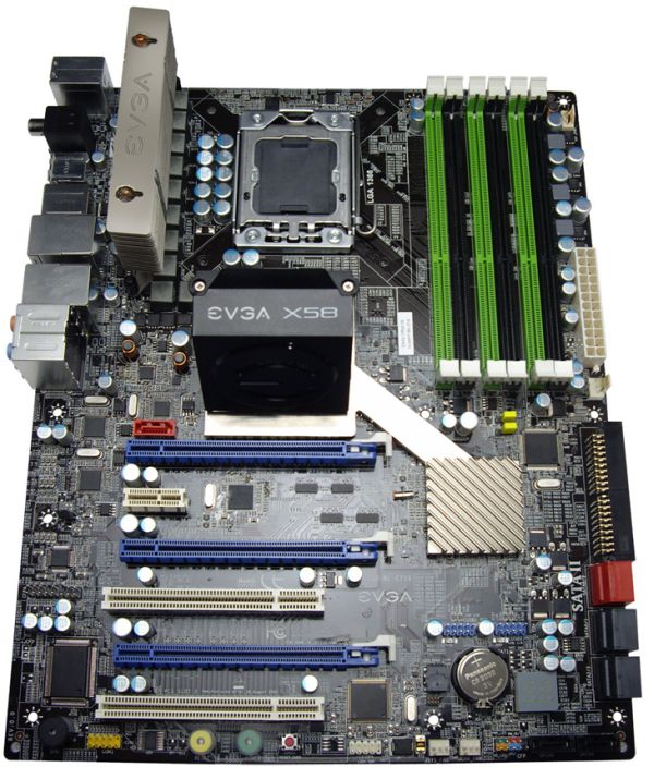 Сегодня сайт Hot Hardware опубликовал фотографию материнской платы EVGA X58 SLI FTW на базе чипсета Intel X58. Подсистема питания оснащена собственным радиатором на тепловых трубках. На чипсете размещён кулер с вентилятором, развёрнутым перпендикулярно к плоскости материнской платы.
