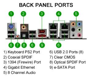 Расположение портов на задней панели можно увидеть на картинке. Особо следует отметить наличие двух гигабитных сетевых контроллеров, порта e-SATA и кнопки сброса CMOS. Число портов USB 2.0 на задней панели достигает восьми, а общее число портов SATA - десяти штук. По предварительным оценкам, эта плата способна повышать напряжение на ядре процессора до величин более 2.0 В без модификации подсистемы питания.