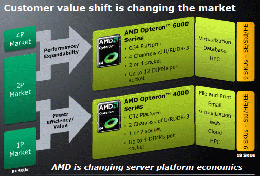 Вчера компания AMD присвоила официальные обозначения процессорам Magny-Cours в исполнении Socket G34: они появятся на рынке в ближайшие двенадцать месяцев под торговыми марками серии Opteron 6000. Эти процессоры будут выпускаться по 45 нм технологии, поддерживать четырёхканальную память типа DDR-3 (до 12 модулей на один процессорный разъём) и четыре канала HyperTransport. Количество процессорных ядер может изменяться от 8 до 12 штук в зависимости от модели. Анонс процессоров серии Opteron 6000 намечен на первый квартал 2010 года.