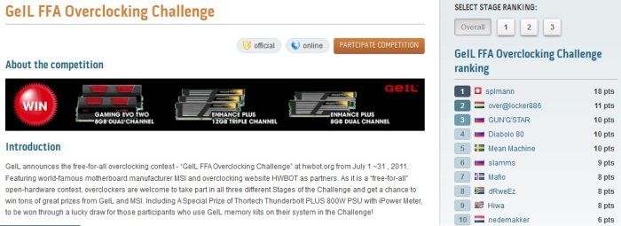 База результатов HWbot.org ограничивается не только стандартными состязаниями в общепринятых бенчмарках, но и проводит соревнования при поддержке производителей железа с интересными и трудновыполнимыми заданиями. Одним из таких конкурсов оверклокерского мастерства стал Geil FFA Overclocking Challehge. FFA означает free-for-all, то есть любой желающий оверклокер может попробовать свои силы в трёх конкурсных заданиях. Естественно, что Geil, как производитель оперативной памяти, ориентировала свои задания в первую очередь под разгон именно интересующего их компонента, то есть, оперативной памяти.