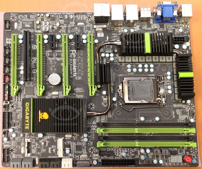 Дизайнеры Gigabyte, по всей видимости, прислушались к "гласу народа", и в материнской плате G1.Sniper 3 не стали использовать стилизованные под различные части огнестрельного оружия радиаторы. Вместо них элементы охлаждают такие же, как и у предыдущих решений, радиаторы с широкими рёбрами, но раскрашенные в характерные для серии цвета.