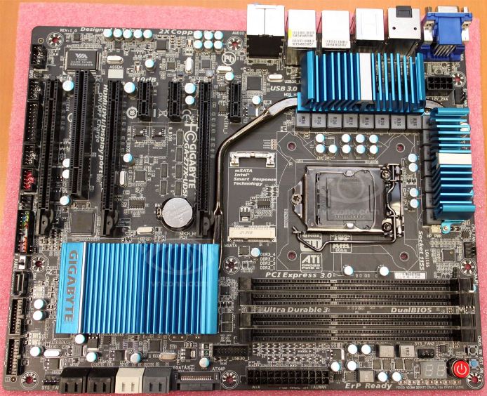 Плата GA-Z77X-UD3H выглядит сильно упрощённой версией своей старшей родственницы: изменена конструкция VRM, за охлаждение отвечают два, на первый взгляд, весьма хлипких радиатора, а сама печатная плата выглядит довольно бедно. Сочетание слотов расширения осталось прежним, но исчезли три дополнительных порта SATA 6 Гбит/с, убрано несколько игольчатых разъёмов для внутренних портов USB.