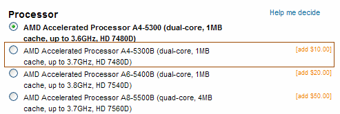Последний из производителей по каким-то причинам присваивает процессору A4-5300B более высокую "турбо-частоту" (3.7 ГГц) и увеличенную на $10 цену по сравнению с процессором A4-5300 (3.4/3.6 ГГц). По идее, отличий в характеристиках бизнес-модели демонстрировать не должны: