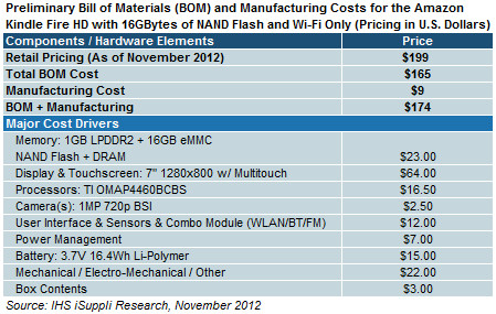 Глава Amazon не так давно признался, что компания продаёт мобильные устройства семейства Kindle по себестоимости, стремясь зарабатывать не на продаже самого "железа", а на предоставлении услуг его покупателям. Специалисты IHS iSuppli провели последнюю неделю весьма продуктивно, поскольку к отчётам по структуре себестоимости iPad mini и Microsoft Surface они добавили аналогичный материал, имеющий отношение к планшету Amazon Kindle Fire HD с семидюймовым экраном.