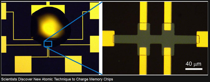 В качестве донора частиц компания IBM использует так называемую ионную жидкость, насыщенную положительными или отрицательными ионами. На макете это выглядит как капля ионной жидкости поверх металлооксидного канала. В своём естественном состоянии оксид металла является изолятором. Под воздействием положительно заряженных ионов в капле жидкости, которыми управляет внешнее электромагнитное поле, происходит восстановление оксида в канале до полной металлизации (в опыте используется оксид ванадия). Тем самым металлооксидный канал превращается в проводник тока. Как показал эксперимент, после снятия управляющего поля канал не потерял своих проводящих свойств. Попросту говоря, проявился эффект памяти или энергонезависимость. Ага, NAND-флэш памяти давно ищут замену. Возможно, будущее скрыто в капельке воды? На снимке ниже слева видна капля жидкости на группе контактов, а справа увеличенный фрагмент металлооксидного канала, оказавшегося под жидкостью.
