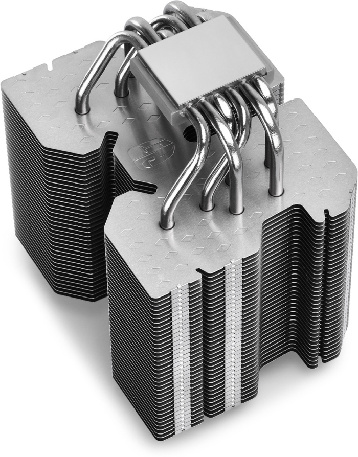 Медное никелированное основание кулера соединяется шестью 6-миллиметровыми тепловыми трубками с радиатором, который условно можно считать двухсекционным, хотя составляющие его алюминиевые пластины имеют непрерывную поверхность. Кулер комплектуется вентилятором со скоростью вращения 700-1400 оборотов в минуту, который способен за аналогичный промежуток времени прокачивать через радиатор 81.33 кубического фута воздуха (около 138 кубических метров в час) при уровне шума от 17.8 до 31.1 дБА.